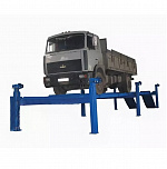г/п. 20 тонн. Четырехстоечный. Электромеханический. Для ремонта грузовых автомобилей и автобусов на любой ровной площадке. Привод червячный редуктор, с концевыми выключателями нажимного действия, ограничивающими ход каретки. Рабочие гайки повышенной прочности и износостойкости. Многоуровневая система безопасности. По отдельному заказу комплектуется установочными рамами. Поставляется в 2 вариантах Стандарт (в помещение) и ТЗ (Для эксплуатации на улице).