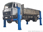 г/п. 15 тонн. Четырехстоечный. Электромеханический. Для ремонта грузовых автомобилей отечественного и импортного производства и автобусов на любой ровной площадке. Привод червячный редуктор, с концевыми выключателями нажимного действия, ограничивающими ход каретки. Рабочие гайки повышенной прочности и износостойкости. Многоуровневая система безопасности. По отдельному заказу комплектуется установочными рамами. Поставляется в 2 вариантах Стандарт (в помещение) и ТЗ (Для эксплуатации на улице).