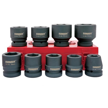 Набор ударных торцевых 6-гранных головок для гайковерта 3/4” – 17, 19, 22, 24, 27, 32, 36, 38мм. 8шт. Cr-Mo. Для слесарных постов в автосервисе и т.п. Черные. Покрытие – чернение.
