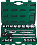 Набор головок торцевых 6-гранных 24 предмета. В комплекте: головка 1/2" - 18 шт, удлинитель 1/2" - 2 шт, вороток с шарниром 1/2", вороток с плавающей головкой 1/2", трещотка 1/2, карданный переходник 1/2".