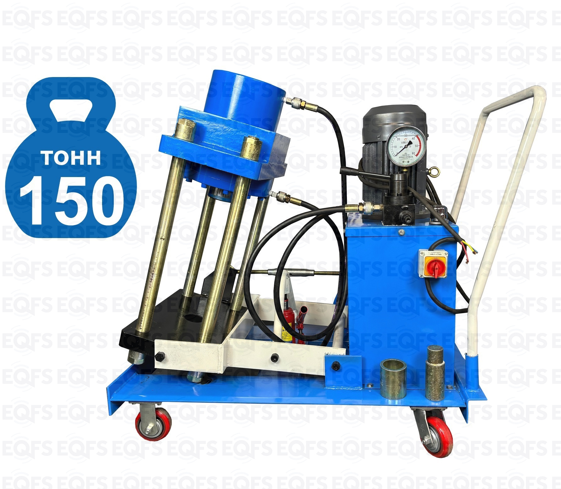 Сокращает время ремонта. Позволяет работать под разными углами 1 человеку. Мобильный. Для выпрессовки шкворней из поворотной цапфы погрузчиков, тракторов, строительной техники, коммерческих и грузовых авто отечественного и импортного производства: MAN, MERCEDES, SCANIA, VOLVO, Корейские и Китайские авто. Электрогидравлический привод. Рабочее окно 400x320 мм. Усилие 150 тонн.