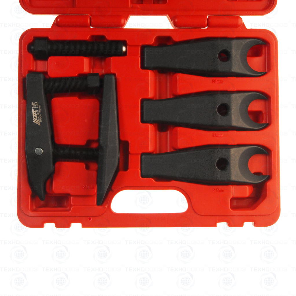 Комплектация Съемник. Силовые винты. Насадки для съемника. Описание Инструмент предназначен для быстрого и легкого снятия шаровых опор у автомобилей европейского производства. Размеры: 24 мм, 27 мм, 31 мм, 36 мм. Применение BMW E38, E39, E52, E53, E60, E61, E70, E83, E90, E91, E92, R50, R52, R53, RR1, RR2, XS; Mercedes W211, W219, W220 и W230; PORSCHE 996 Carrera; AUDI A4, A6 (шаровая опора нижнего рычага).
