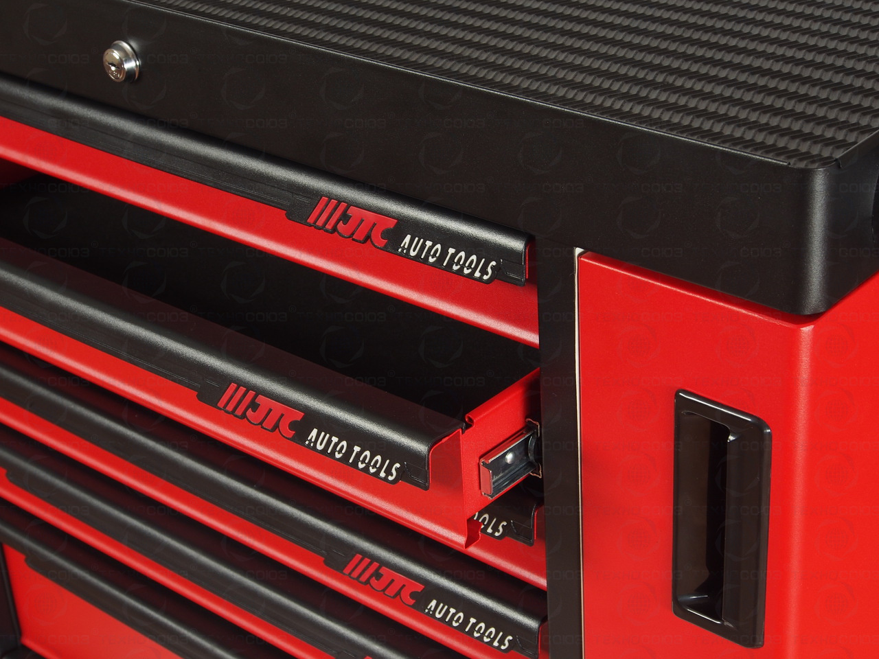 - Перфорированные внутренние стенки боковых ящиков с квадратными отверстиями предоставляют возможность разместить дополнительные аксессуары для хранения инструментов. Применяется с серией подвесных приспособлений JTC-3218.