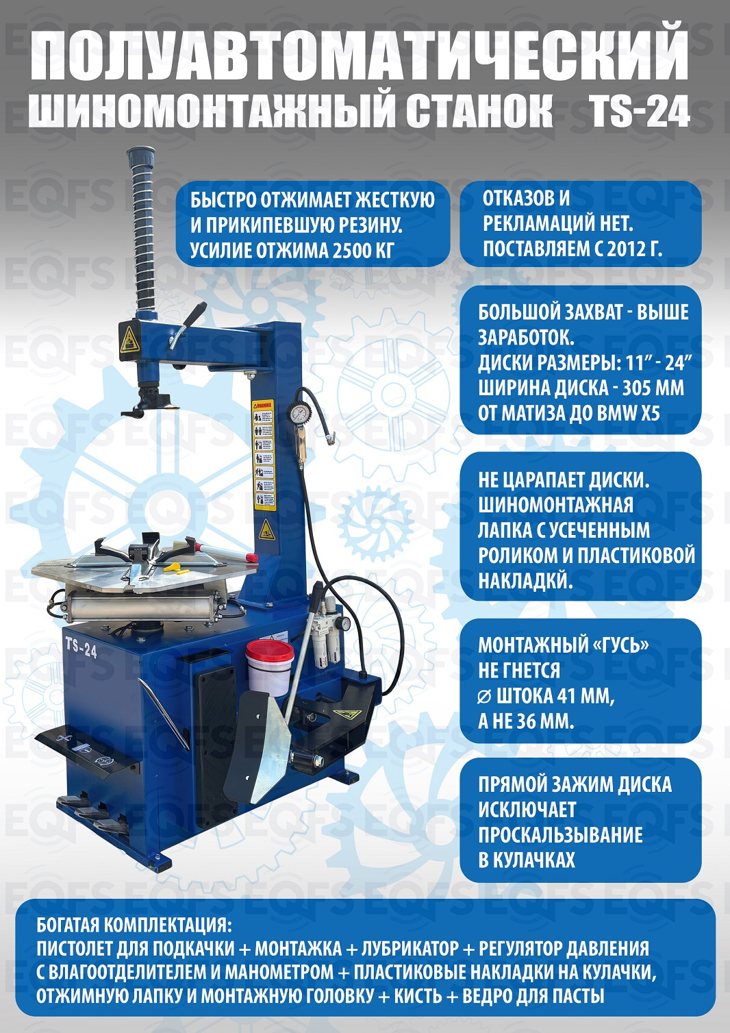 TS-24 Станок шиномонтажный. Полуавтоматический. Квадратный стол. Для дисков: внешний 11÷21”, внутренний 12÷24”. Усилие отрыва покрышки 2700 кг. В комплекте: пистолет для подкачки шин + монтажка + пластиковые накладки на зажимные кулачки + регулятор давления с влагоотделителем и манометром.