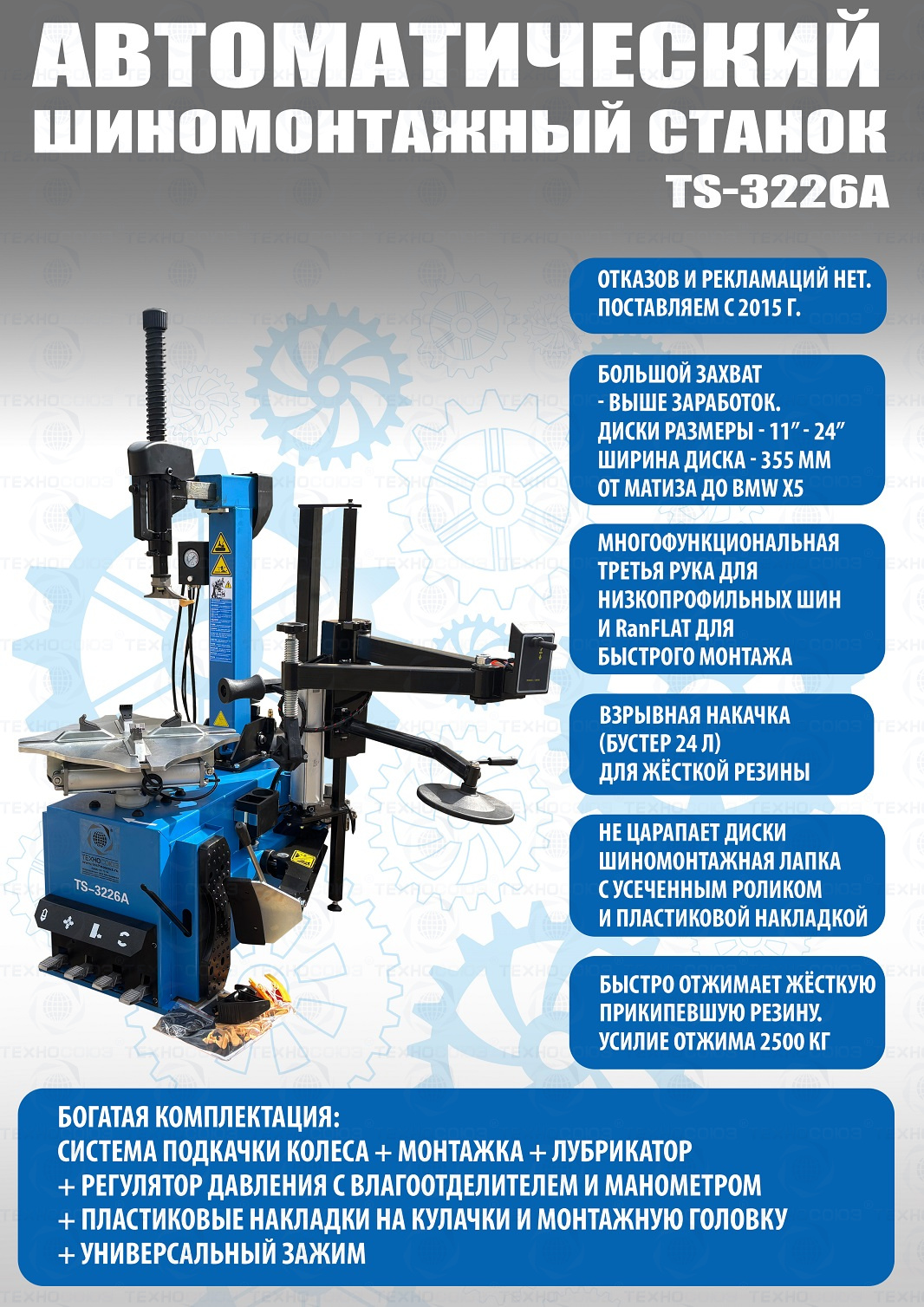- . Гарантия на подъемники, шиномонтажные станки, балансировочные станки, ОСК и прочее технологически сложное оборудование, действительна только в случае если монтажные или пусконаладочные работы производились сервисной службой ООО «Техносоюз» или уполномоченными дилерами.