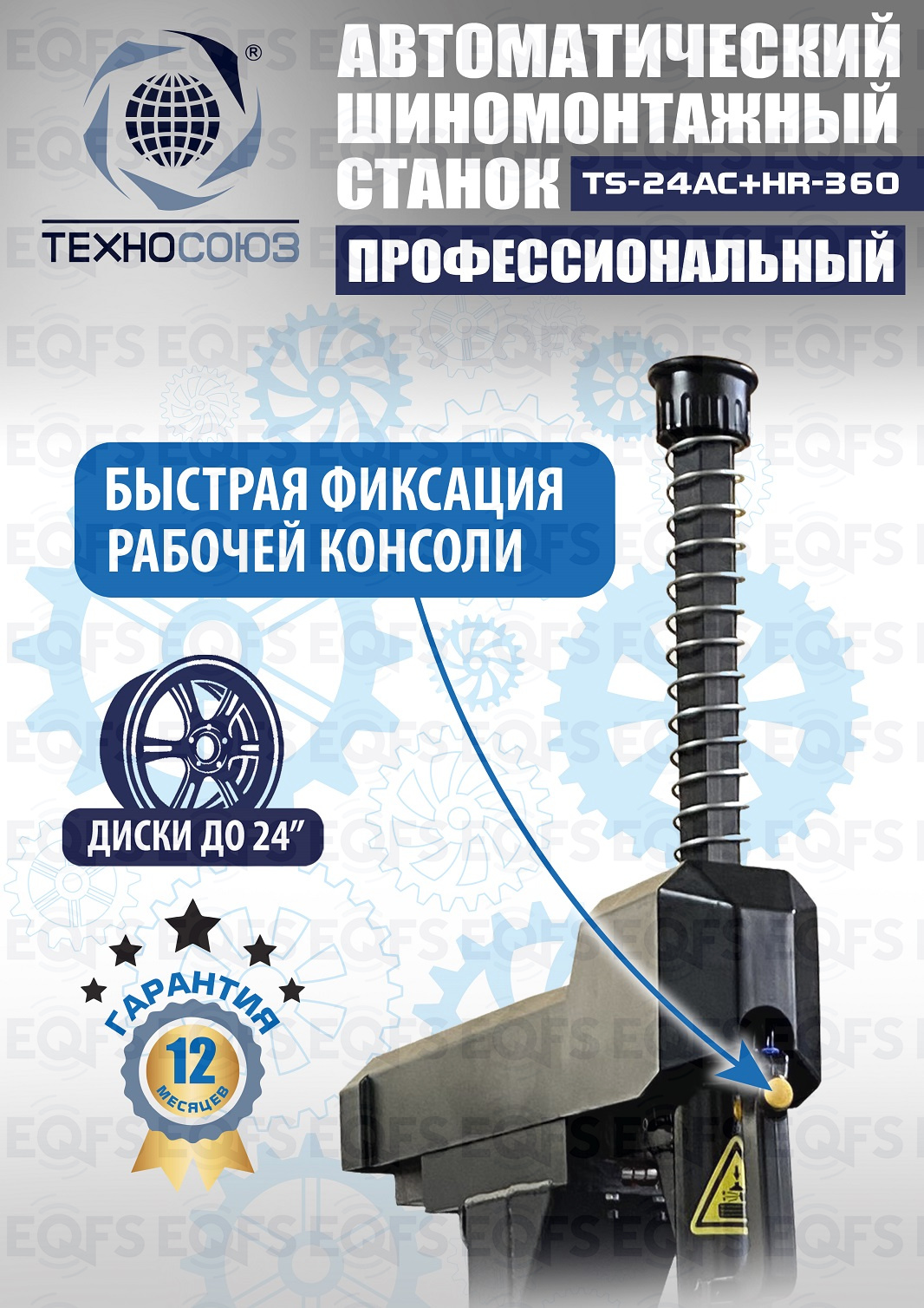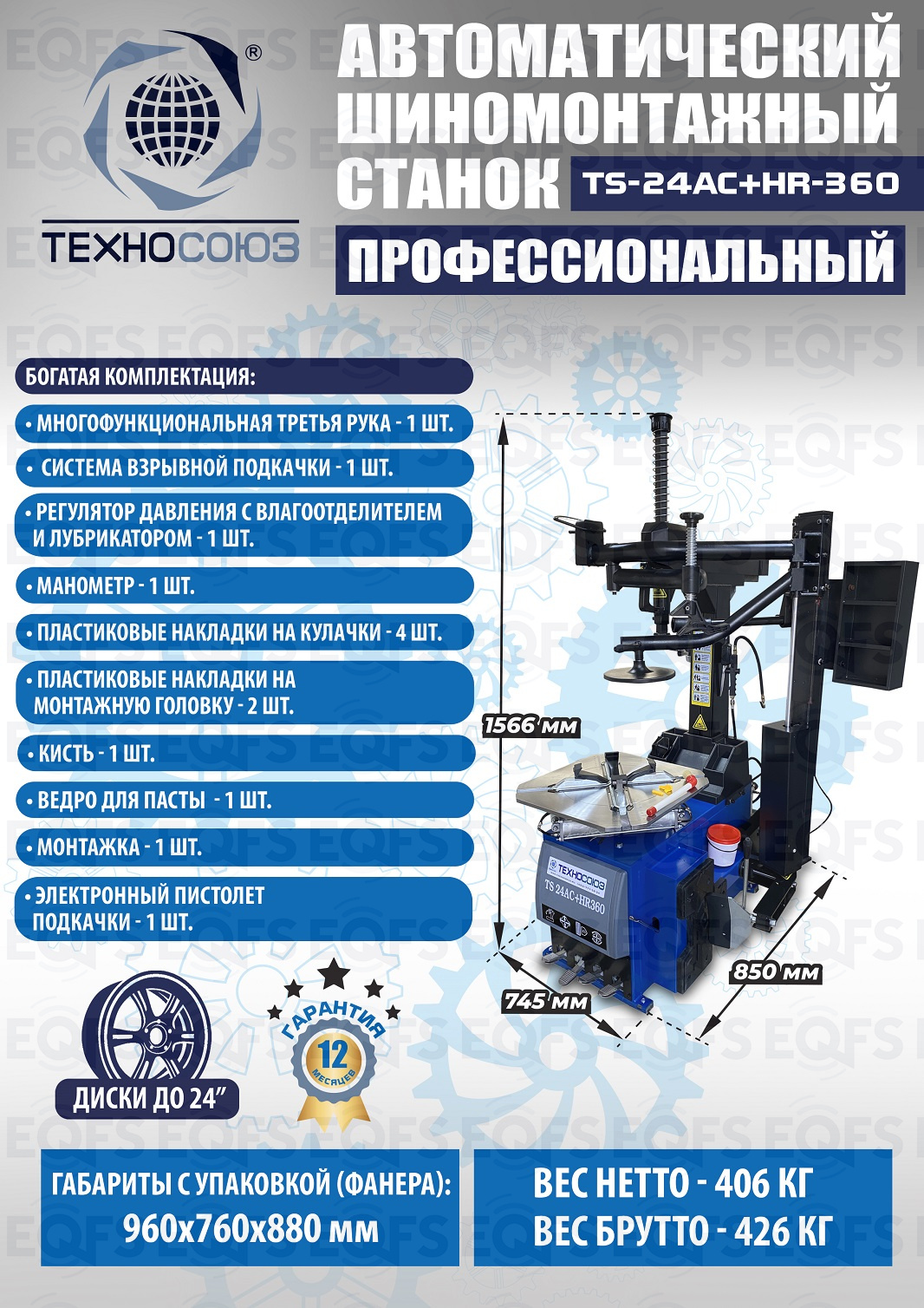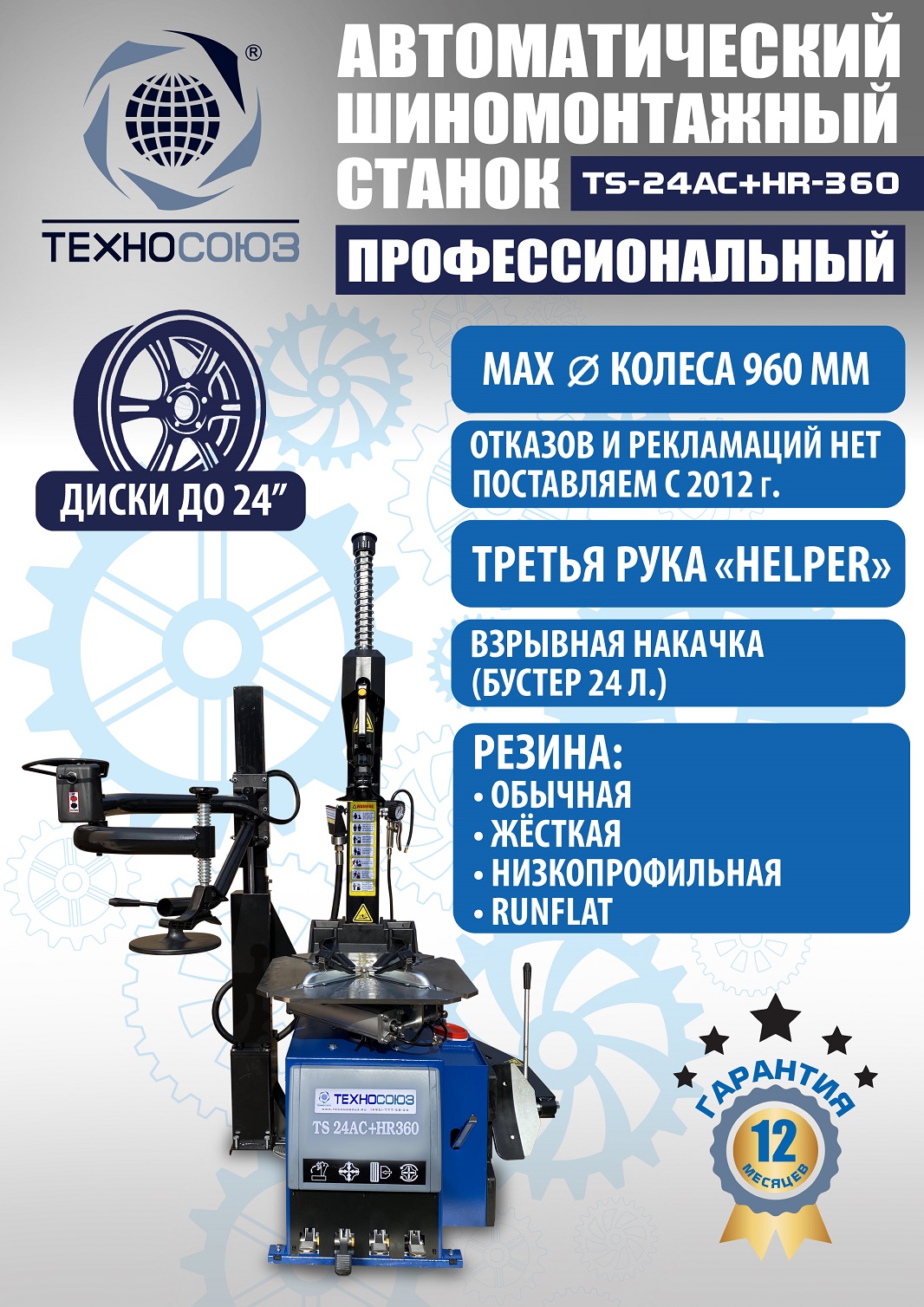 Автоматического шиномонтажного стенда TS-24AC+HR-360. В комплекте взрывная подкачка + третья рука для работы с низкопрофильными шинами и RanFlat! Для колес легковых автомобилей, легких грузовиков, микроавтобусов и коммерческой техники. Для дисков: внешний 10÷21”, внутренний 12÷24”. Напряжение 220/380В. Гарантия 18 мес. – наш монтаж, 12 мес. – самостоятельная установка.
