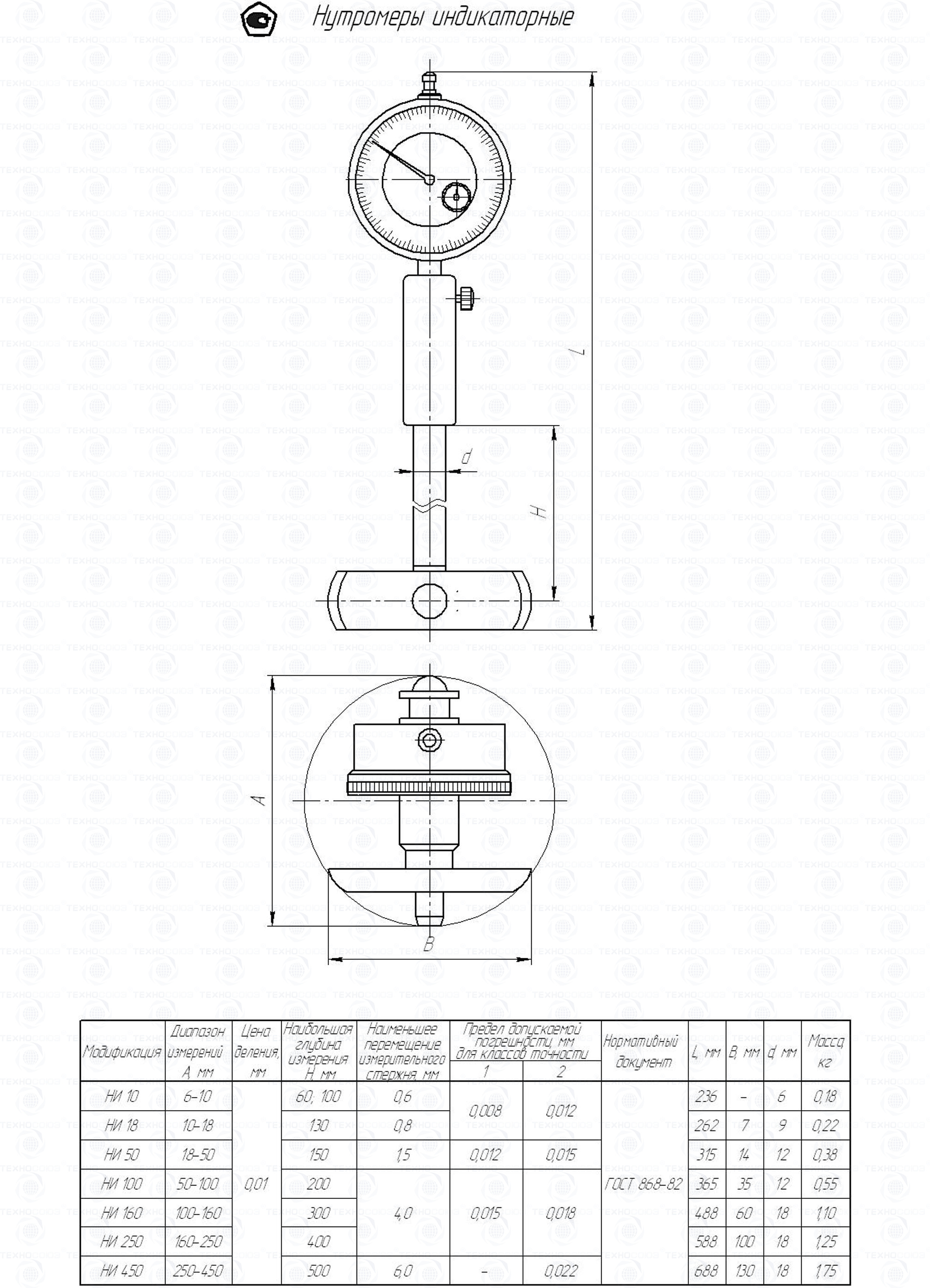Нутромеры индикаторные с ценой деления 0,01 мм. Предназначен для измерения внутренних размеров от 18 до 50 мм. В нутромерах НИ 50, НИ 100, НИ 160, НИ 250, НИ 450 перемещение подвижного измерительного стержня передается на отсчетное устройство при помощи рычажной передачи. Измерительные поверхности стержней оснащены твердым сплавом. Класса точности 1. ГОСТ 868-82. Поставляется в двух вариантах с поверкой и без поверки!
