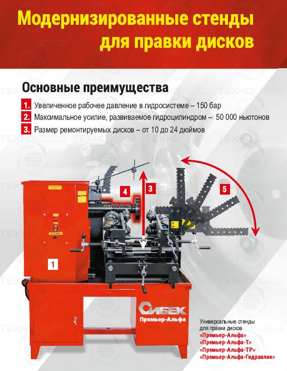 Стенд "Премьер-Альфа-Гидравлик" предназначен для исправления дефектов геометрии литых и кованых дисков легковых автомобилей от 10 до 24 дюймов, а также восстановления полки и бортовых закраин штампованых дисков легковых автомобилей с посадочным диаметром от 13 до 17 дюймов, включая диски автомобилей семейства "Газель".