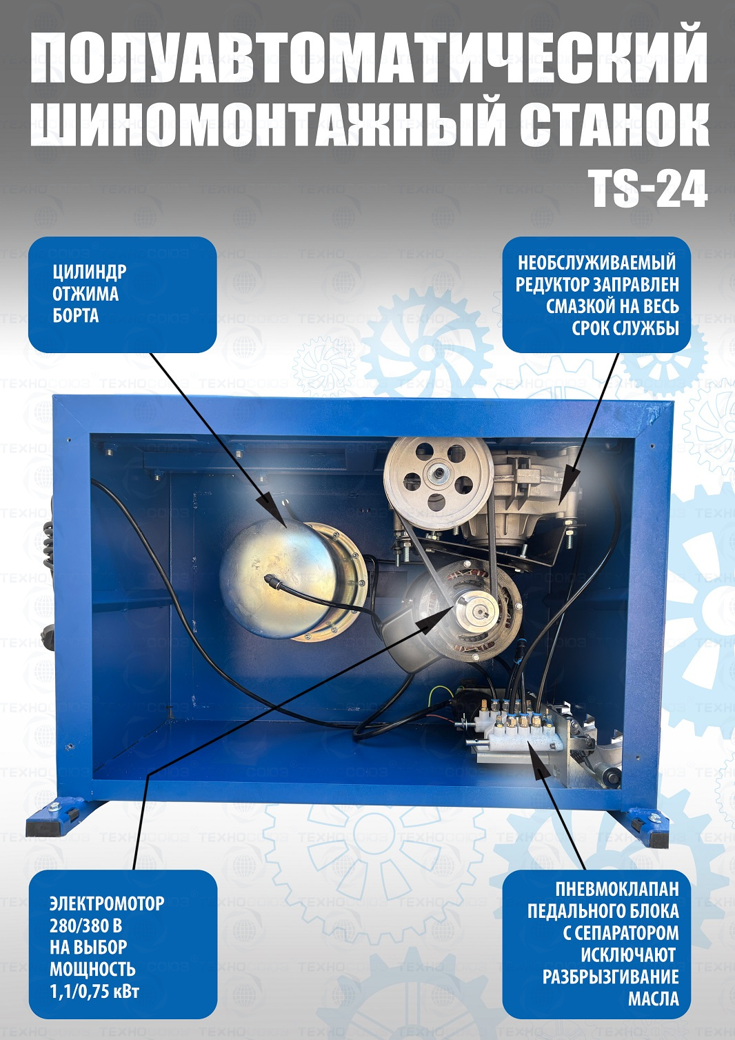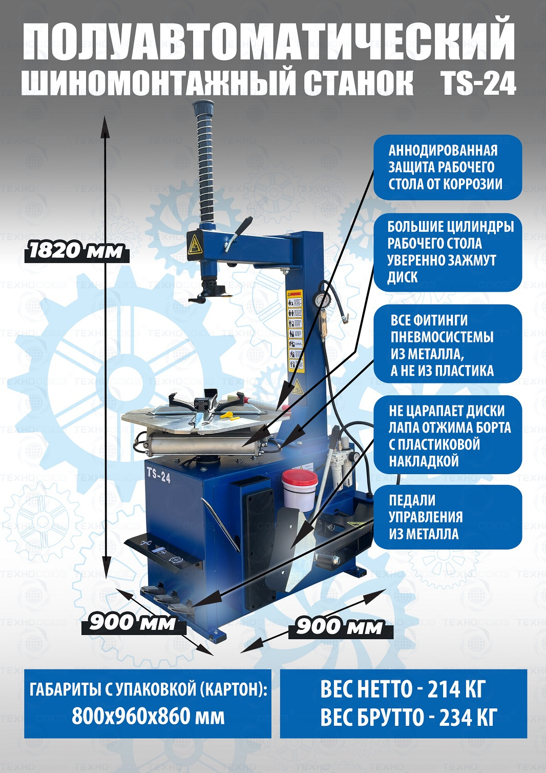 TS-24 шиномонтажный станок. Полуавтоматический. Квадратный стол. Рекомендуется для постов со средней и высокой проходимостью. Для дисков: внешний 11÷21”, внутренний 12÷24”. Усилие отрыва покрышки 2700 кг. В комплекте: пистолет для подкачки шин + монтажка + пластиковые накладки на зажимные кулачки + регулятор давления с влагоотделителем и манометром. Поставляем на 220В и 380В.