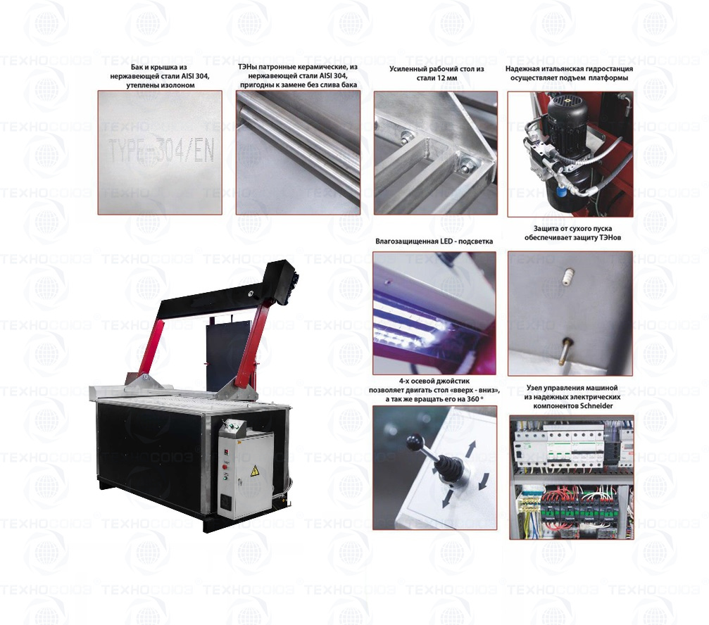 Температура воды в баке доводится до необходимой, при помощи трубчатого электрического нагревателя (ТЭНа). К поворотному столу специальными зажимами, поставляемыми в комплекте, крепится исследуемая деталь. К детали подводится сжатый воздух от пневмосистемы (штатного компрессора). Подъем/опускание поворотного стола осуществляется надежной итальянской гидростанцией. При помощи ручного привода вращения стола, деталь поворачивается под любым углом, что обеспечивает доступ ко всем скрытым полостям. Удобный 2-х позиционный джойстик, расположенный на панели управления, рассчитан на выполнение всех рабочих операций. Контроль давления осуществляется манометром.