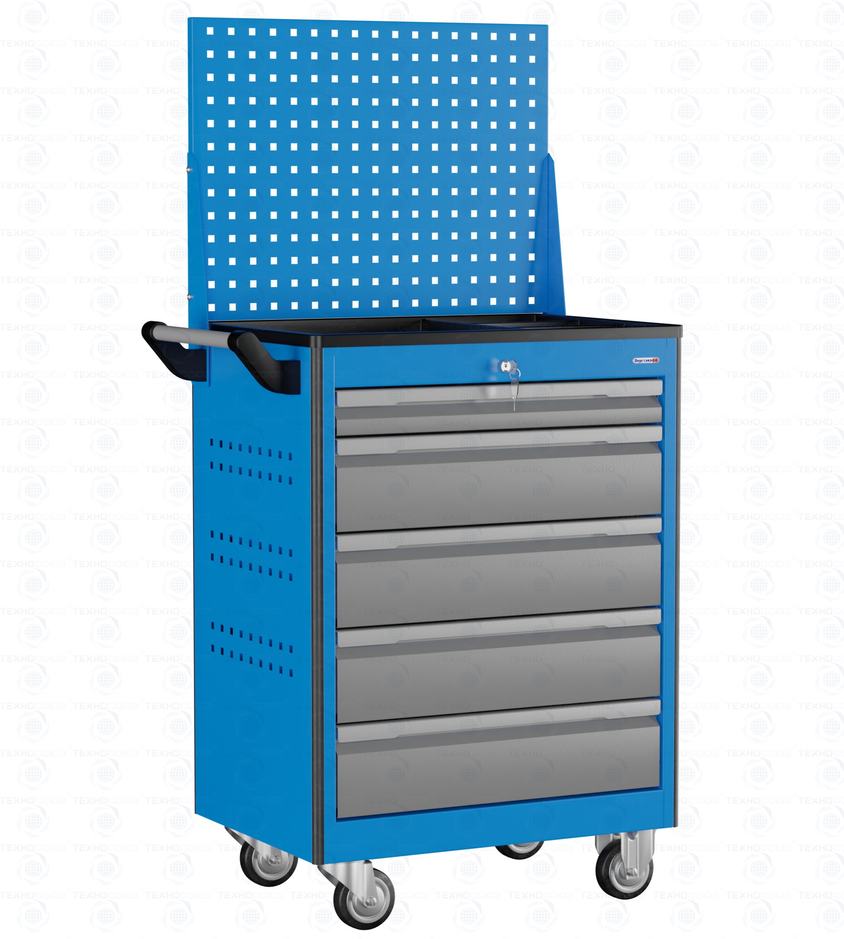 Тележка инструментальная TNC 950.5 Р с 5 выдвижными ящиками и перфорированным экраном. Предназначена для хранения и транспортировки к рабочему месту инструментов, приборов и другой оснастки, необходимых для работы на сервисных и слесарных участках, а также в цехах заводов и на промышленных предприятиях.