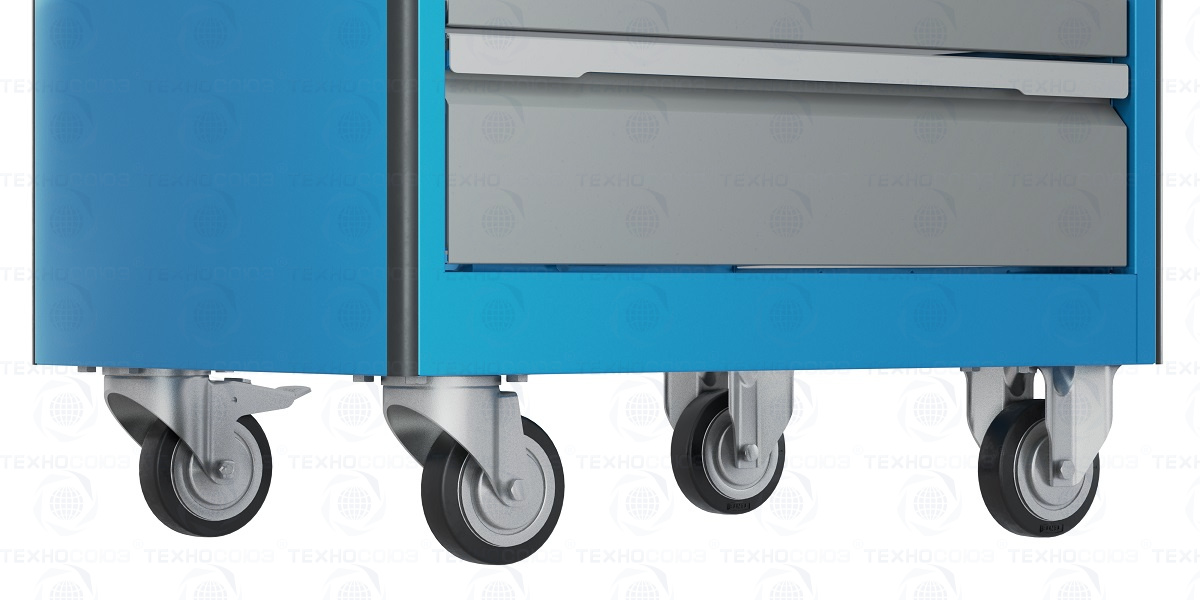 Все металлические элементы тележки покрыты полиэфирной порошковой краской, обеспечивающей хорошую износостойкость покрытия и стойкость его к моющим средствам и смазочным веществам. Цвет и текстура покрытия корпуса тележки RAL 5015, полуматовое. Цвет и текстура покрытия ящиков тележки RAL 7037, глянцевое. Цвет и текстура покрытия накладок на ящики RAL 9006, глянцевое. На крыше тележки установлен формованный лоток, выполненный из АБС-пластика толщиной 2 мм. В лотке имеется одно большое основное отделение и три малых отделения для хранения метизов и небольшого инструмента. Тележка снабжена центральным замком с поворотом ригеля 180 градусов, который закрывает одновременно все ящики. Замок неподвижно и прочно закреплен на корпусе тележки. В комплекте имеется два ключа. Тяга замка подпружинена.