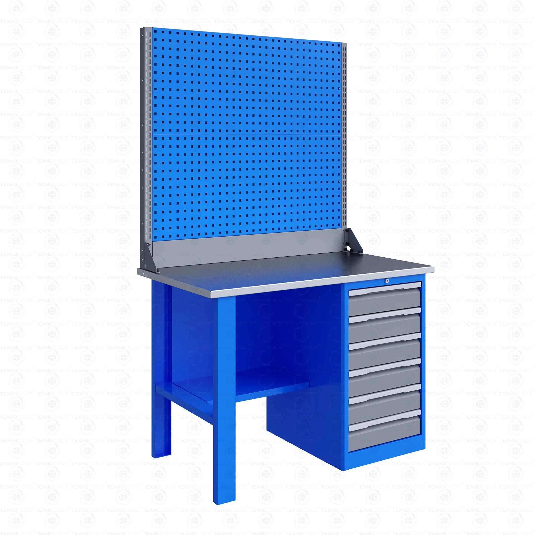 Верстак комплектуется полкой-стенкой, расположенной под столешницей для удобного размещения габаритного инструмента и оснастки.