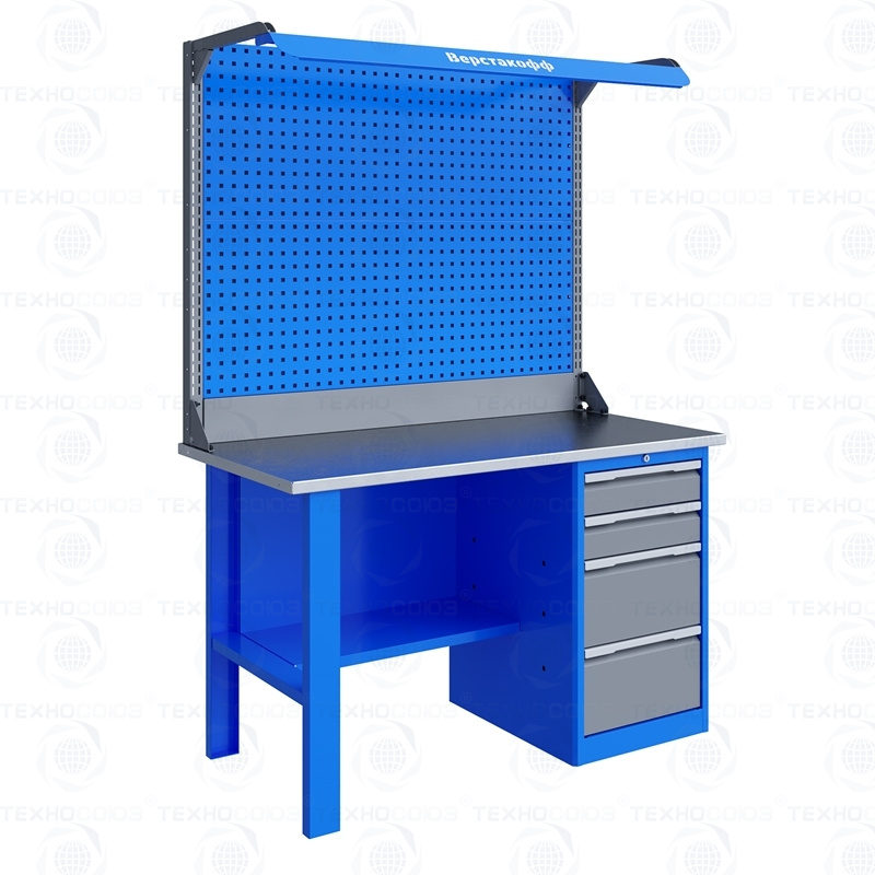 Однотумбовый. Допустимая нагрузка на столешницу 750 кг. Опорные элементы выполнены сварными из холоднокатаной стали. Для выполнения сборочных, ремонтных, слесарных, монтажных и других видов работ на производстве, в сервисных центрах, мастерских, гаражах, а также для обучения технологии в учебных заведениях. Комплектуется полкой-стенкой, расположенной под столешницей для удобного размещения габаритного инструмента и оснастки. Размеры верстака: 855x1396x696 мм. Вес: 78 кг. Поставляется в 4 комплектациях на выбор.