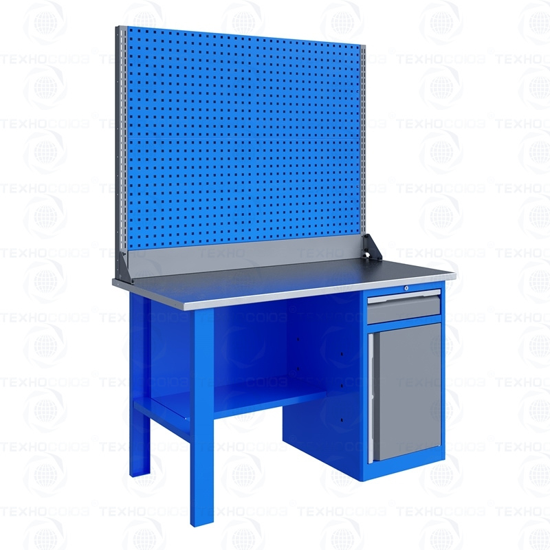 Однотумбовый. Допустимая нагрузка на столешницу 750 кг. Опорные элементы выполнены сварными из холоднокатаной стали. Для выполнения сборочных, ремонтных, слесарных, монтажных и других видов работ на производстве, в сервисных центрах, мастерских, гаражах, а также для обучения технологии в учебных заведениях. Комплектуется полкой-стенкой, расположенной под столешницей для удобного размещения габаритного инструмента и оснастки. Размеры верстака: 855x1396x696 мм. Вес: 63 кг. Поставляется в 4 комплектациях на выбор.